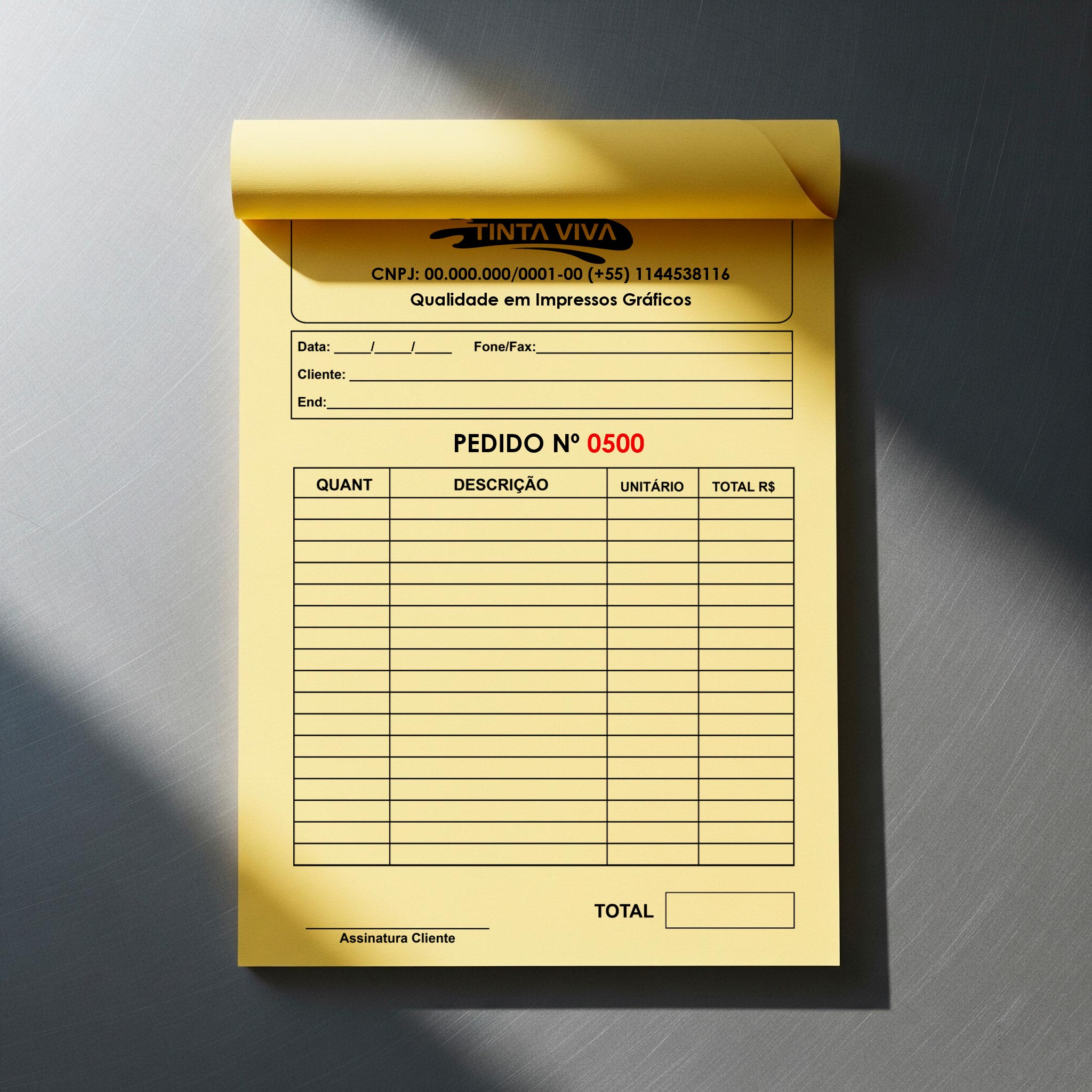 Com a GRÁFICA TINTA VIVA você pode personalizar o seu talão de pedido, com inclusão de logotipos, endereço, telefone, site, redes de relacionamento e outras informações, alinhando o formulário à identidade visual da sua empresa.